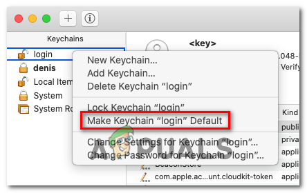 Accessing the Keychain access Utility - From the Keychain Access utility, right-click on login (from the left-hand menu) and choose to Make Keychain “login” Default from the newly appeared context menu.