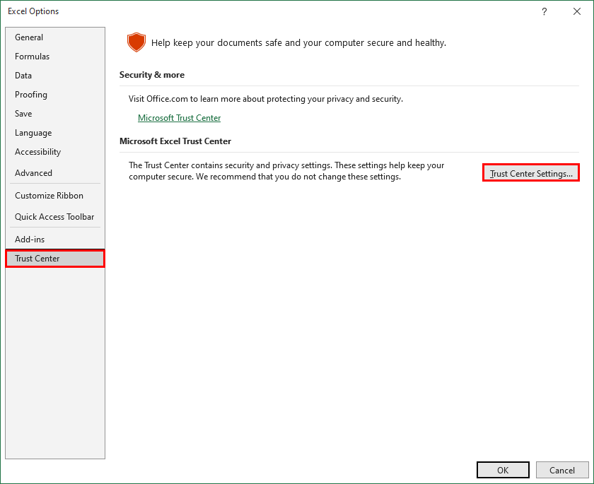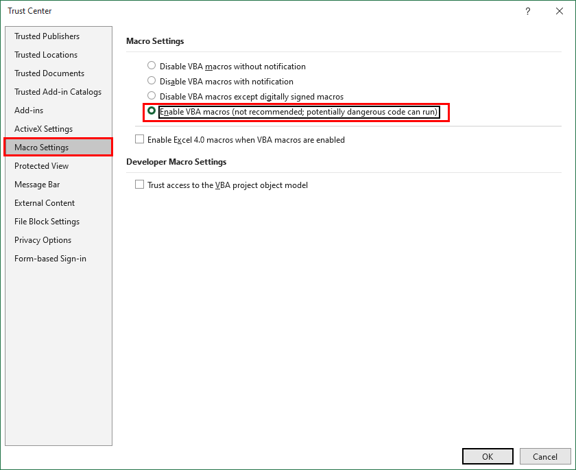 - In the Trust Center Settings dialog, click on Macro Settings.