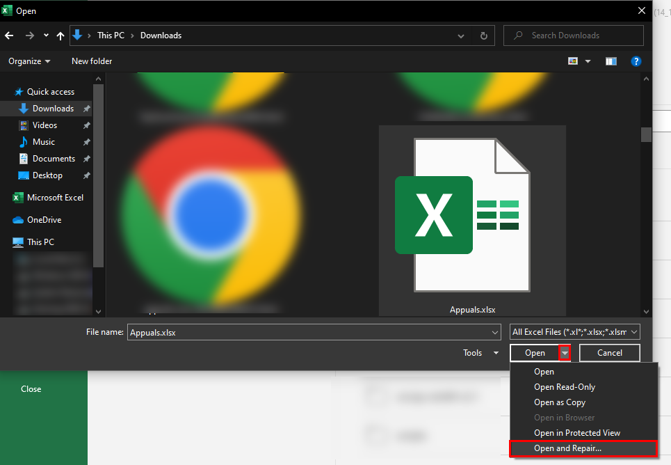 - Find your Excel file, click the dropdown arrow next to the Open button, and select Open and Repair.