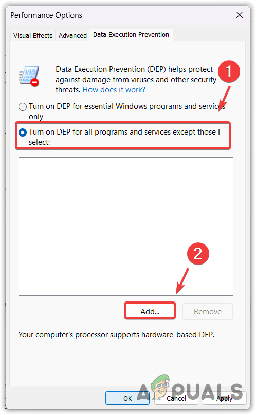 - Select Turn on DEP for all programs and services except those I select and click Add.