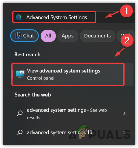 - Here, search Advanced System Settings and hit Enter to open the settings.