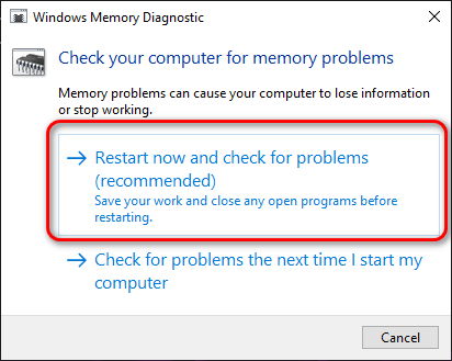 - Select Restart now and check for problems (recommended). This will restart your PC and begin the memory test.