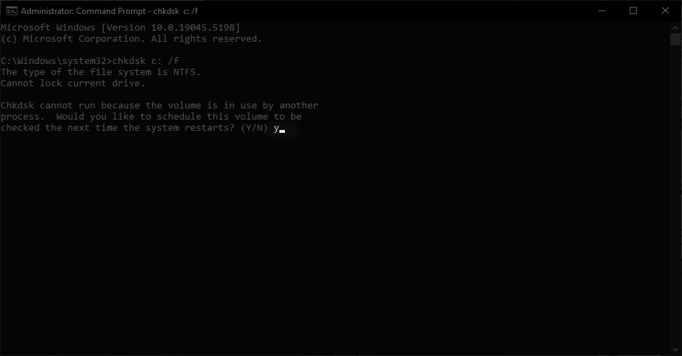 Replace “C:” with the drive letter you want to scan, if it’s not the main drive where your Windows is installed. - If the drive is in use, you’ll be prompted to schedule a disk check after the next restart. Type Y and press Enter to confirm.
