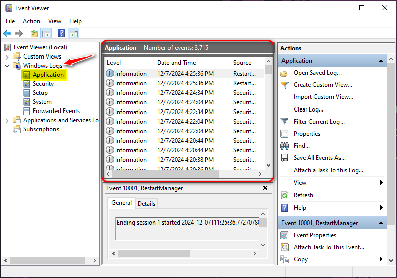- Once the scan is complete, check the result in Event Viewer to see if there are any additional fixes needed. To do this, press Win + R, type eventvwr.msc, and press Enter. Then go to Windows Logs > Application and filter by Chkdsk to find the log of the scan results.