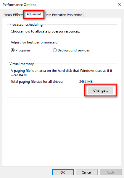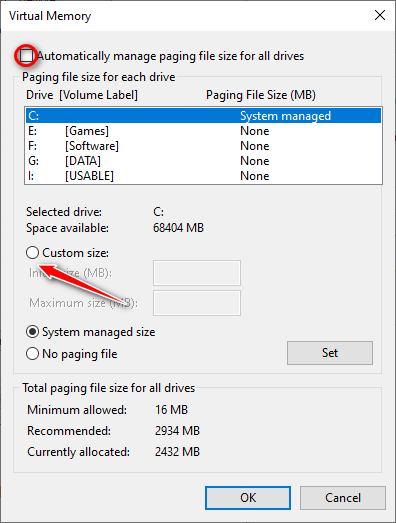 Under Virtual memory, click on Change. - Uncheck “Automatically manage paging file size for all drives”.