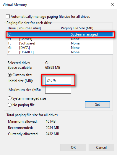 - Multiply your RAM size by 1024 (since 1024MB = 1GB) and then multiply it by 1.5 (e.g., for 16GB RAM, it’s 16 * 1024 = 16,384MB, then 16,384 * 1.5 = 24,576MB).