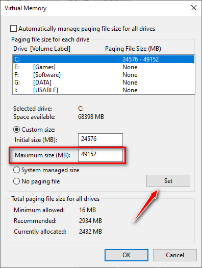 - Multiply your RAM size by 1024 and then multiply it by 3 (e.g., for 16GB RAM, it’s 16 * 1024 = 16,384MB, then 16,384 * 3 = 49,152MB).