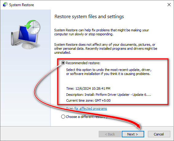 - Follow the on-screen instructions to select a restore point before the error appeared.