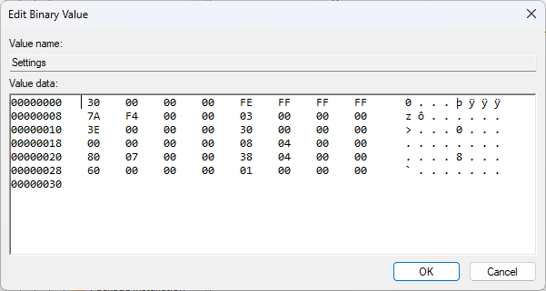 - Locate the row corresponding to the value data 00000028, column FE. Change the value from 01 to 02. This indicates the row number for your taskbar.