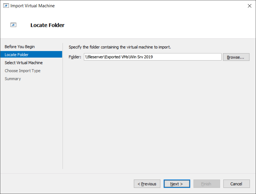 - Under Locate Folder click Browse and add location path where you exported your virtual machine. In our case, it is network share \\fileserver\Exported VMs\Win Srv 2019.