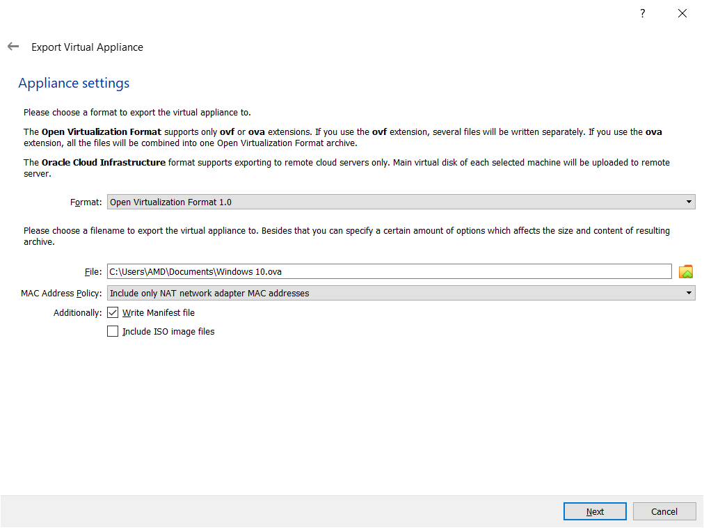 - Under Appliance settings choose the format of the virtual appliance and path and then click Next. The Open Virtualization Format supports only OVF or OVA If you use the OVF extension, several files will be written separately. If you use the OVA extension, all the files will be combined into one Open Virtualization Format archive. The Oracle Cloud Infrastructure format supports exporting to a remote cloud server only. Main virtual disk of each selected machine will be uploaded to the remote server.