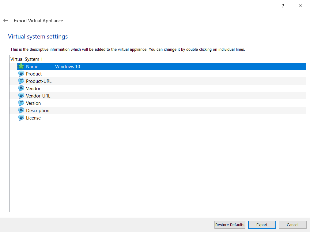 - Under Virtual system settings type the descriptive information which will be added to the virtual appliance and then click Export. You can change it by double clicking on individual lines. We will keep the default settings here and in case we need to change them, we will do it later.