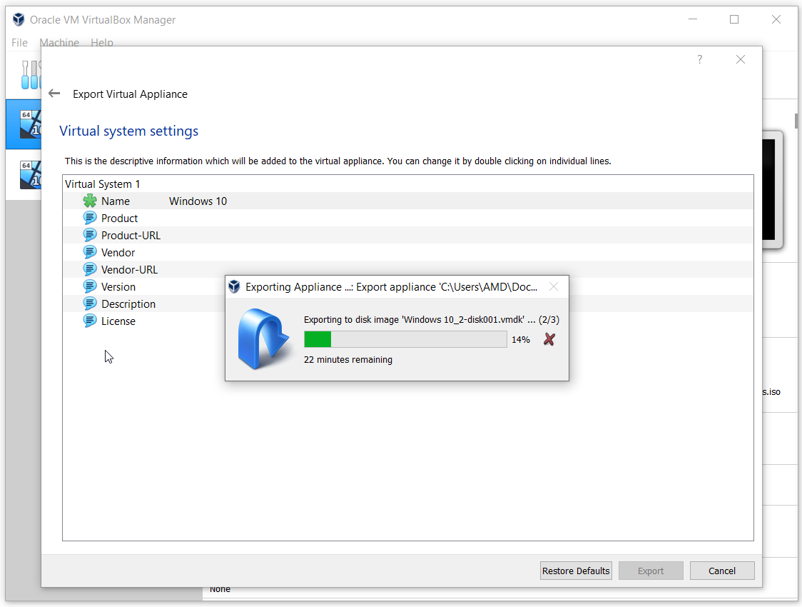 - Wait until Oracle VM VirtualBox finishes exporting the virtual machine to the OVA file.