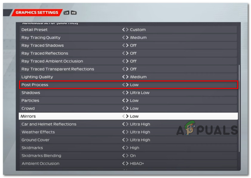 - Post-processing takes up a lot of GPU resources – As it turns out, the most GPU resource-consuming setting that is especially GPU-draining if you’re playing the VR mode of F1 22. A lot of users have reported that the issue was entirely fixed after they disabled the post-process feature from the in-game graphics settings.