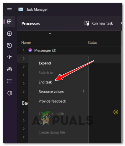 Open Task Manager - On the Processes section, find the Facebook app and click on it.