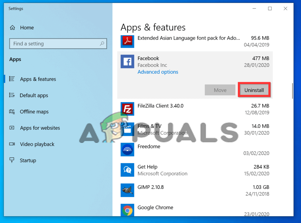 Open Apps & Features - Here, look for the Facebook app on the app list that appeared and tap on it.