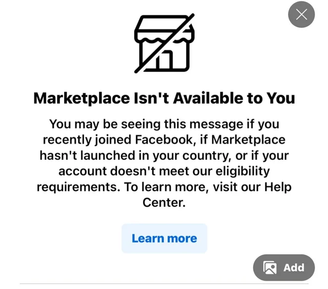 - No access, receiving the message: “Marketplace Isn’t Available to You.”