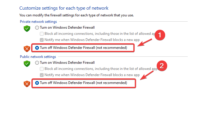 - For both private and public network settings, choose Turn off Windows Defender Firewall (not recommended).