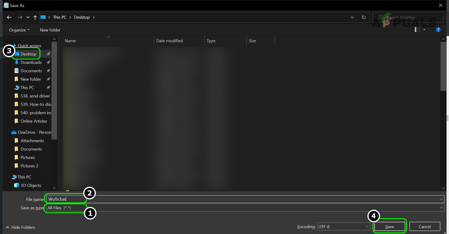 - Now enter the file name with a batch (.bat) extension e.g., Wufix.bat, and click the Save button.
