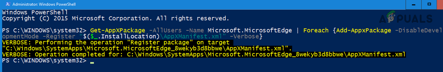Get-AppXPackage -AllUsers -Name Microsoft.MicrosoftEdge | Foreach {Add-AppxPackage -DisableDevelopmentMode -Register “$($_.InstallLocation)\AppXManifest.xml” -Verbose}