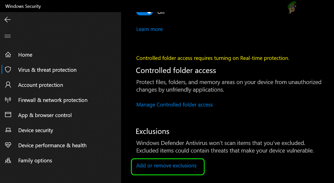 Click on Manage Settings Under Virus & Protection Settings of Windows Defender - Then, scroll down till the end and then click on Add or Remove Exclusions (under Exclusions).