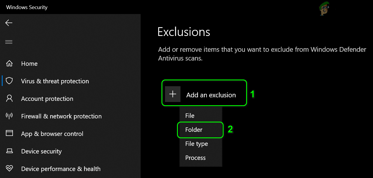 Open Add or Remove Exclusions in Windows Defender Settings - Now click on Add an Exclusion and then in the menu shown, click on Folder.