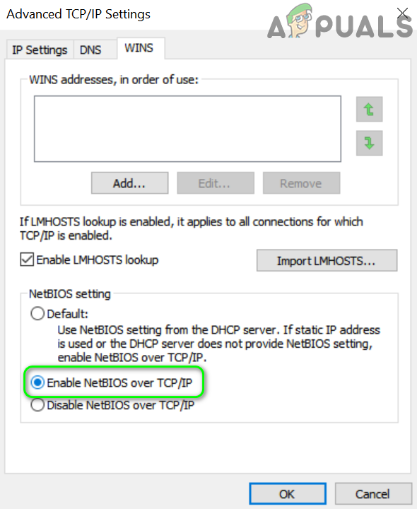 NetBIOS over TCP/IP is the networking protocol used by legacy applications to communicate over TCP/IP networks. You may encounter the error under discussion if NetBIOS over TCP/IP protocol is not enabled. Some users encountered the issue when the said protocol was enabled. In this context, enabling/disabling the NetBIOS over TCP/IP protocol may solve the problem.