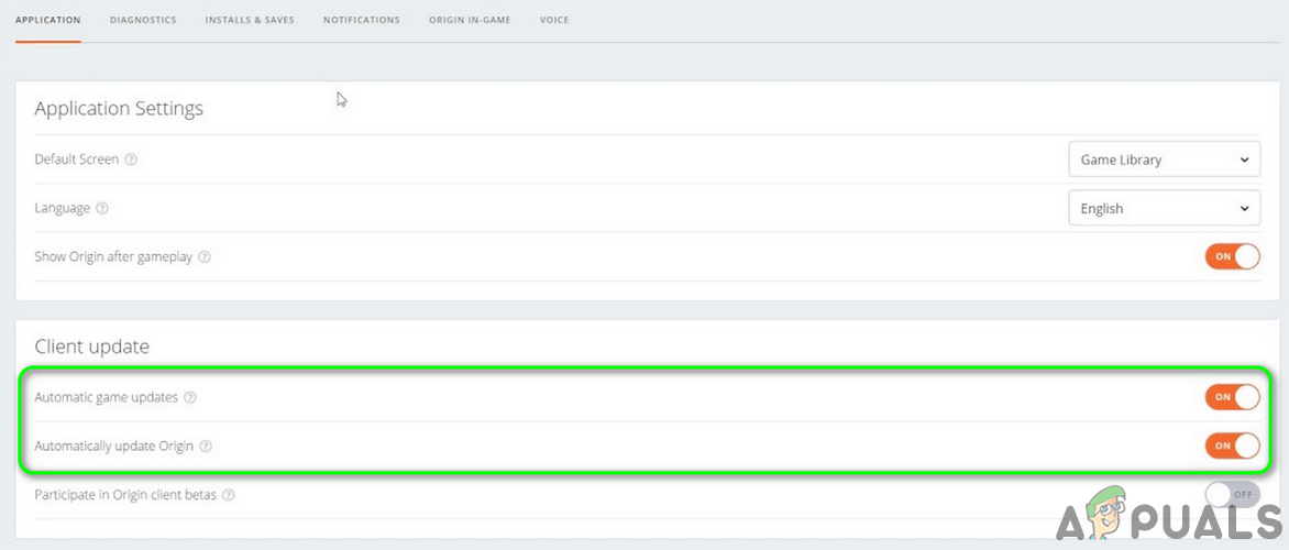 - Make sure Automatic Game Updates and Automatically Update Origin are not disabled (in the Client Update section of the Application Settings).