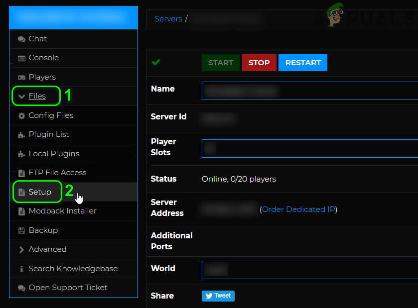 Stop the Minecraft Server - Now in the left pane of the Control Panel window, expand Files and then click on Setup.