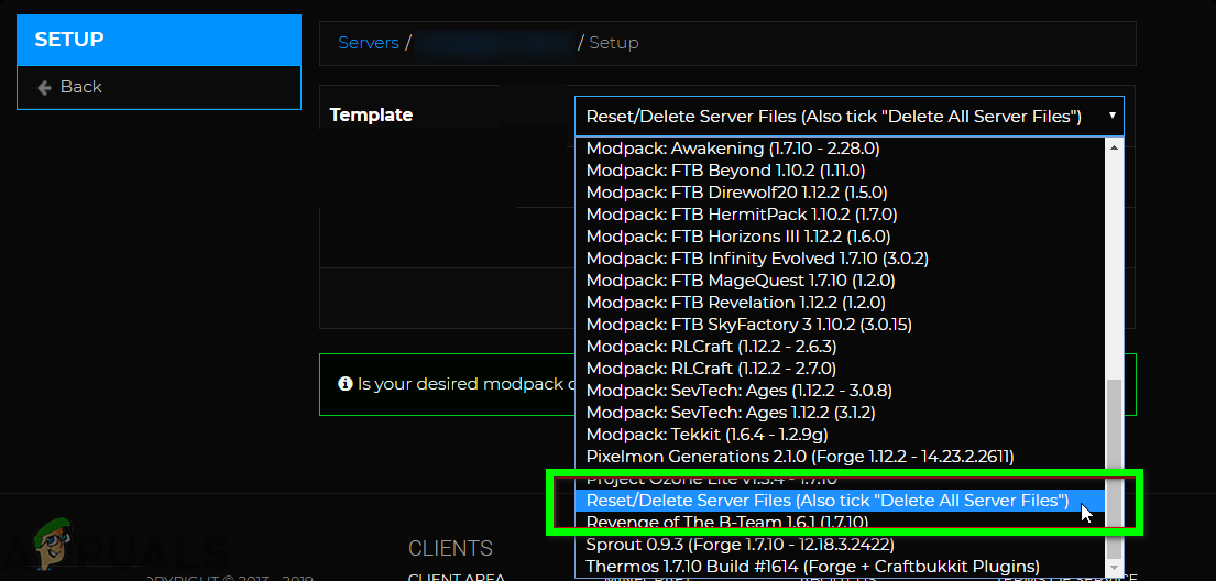 Open Setup of the Minecraft Server - Then in the dropdown of Template, select Reset/Delete Server Files.