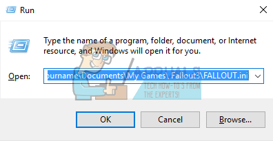 - My Documents < my games < Fallout 3 < FALLOUT.ini. Or you can use the Run application to the location. Press Windows + R and in the dialogue box type “C:\users\yourname\Documents\My Games\ Fallout3\FALLOUT.ini”.