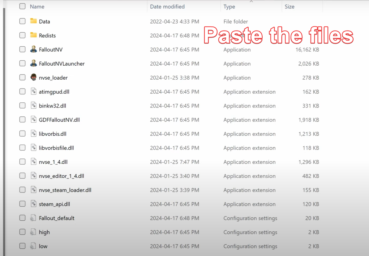 - Now, open the folder where Fallout: New Vegas is installed, and paste the copied files here.