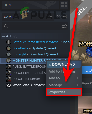 - Open steam, go to the library, Right-click on Moster Hunter Rise and select properties.