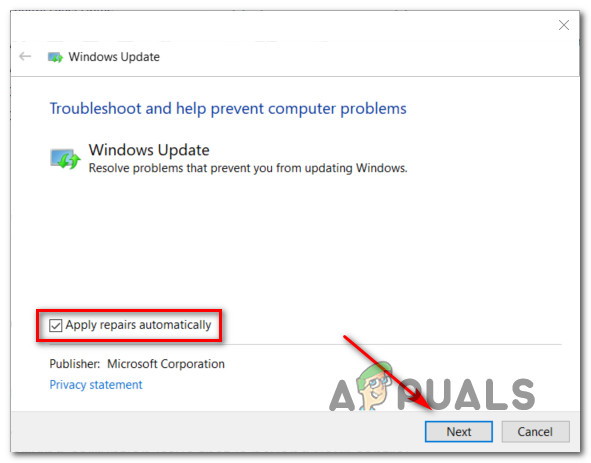 - Once you get to the first screen of the Windows Update troubleshooter, start by clicking on the Advanced hyperlink, then ensure that the box associated with Apply repairs automatically is checked before clicking Next.
