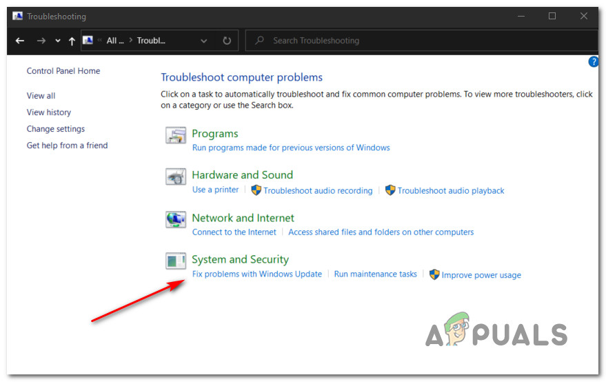 Accessing the Troubleshooting tab - Once you’re inside the Troubleshooting tab, click on the hyperlink named Fix problems with Windows Update (under System and Security).