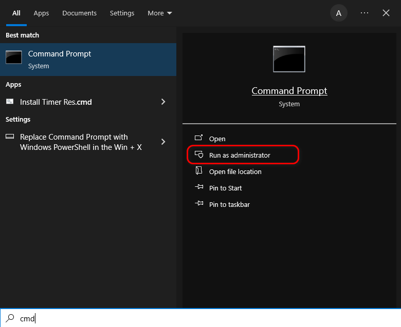 - Open Command Prompt as administrator by searching for “cmd” in Windows search, right-clicking on Command Prompt, and selecting Run as administrator.