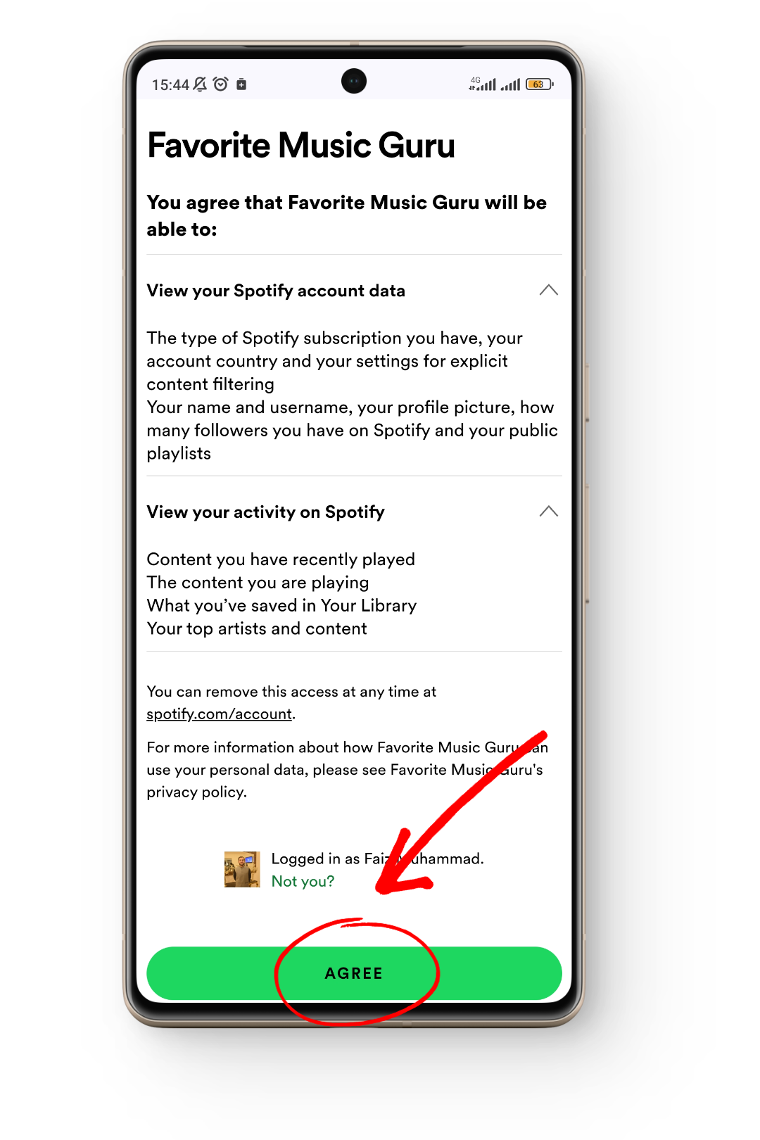 On the next page, you’ll see that Favorite Music Guru is asking permission to access your data. Once you agree, they’ll be able to see your account data and activity on Spotify so that they can provide you with an accurate analysis of your Spotify history. Tap on the Agree button.