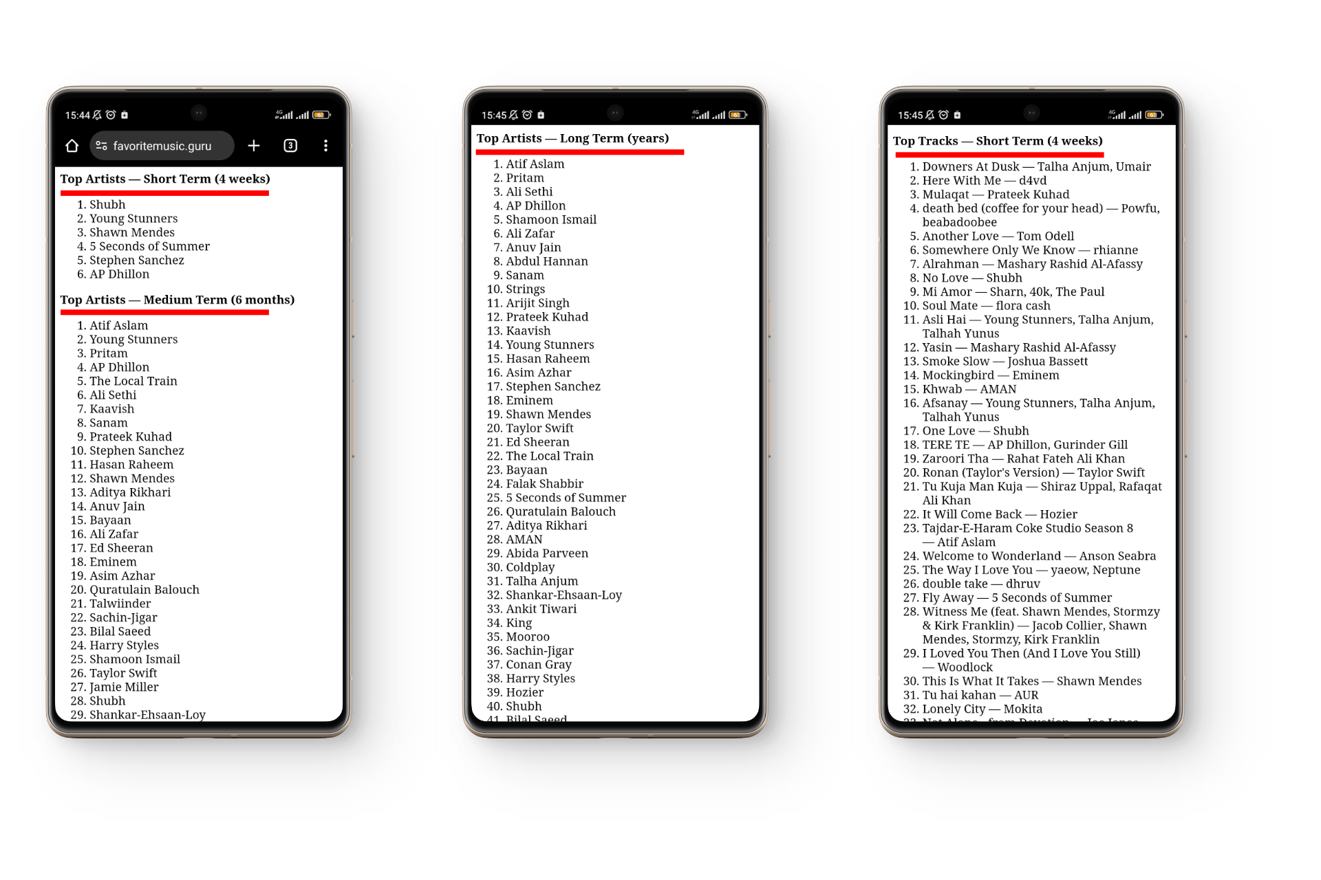Favorite Music Guru collects all our Spotify data using the Spotify API and analyzes it to give us lists of our favorite artists and tracks over different periods of time. You can even find a list of recently played tracks. Although the data presented on a text-only page can look mundane, it gives us valuable insight into our music preferences over time.