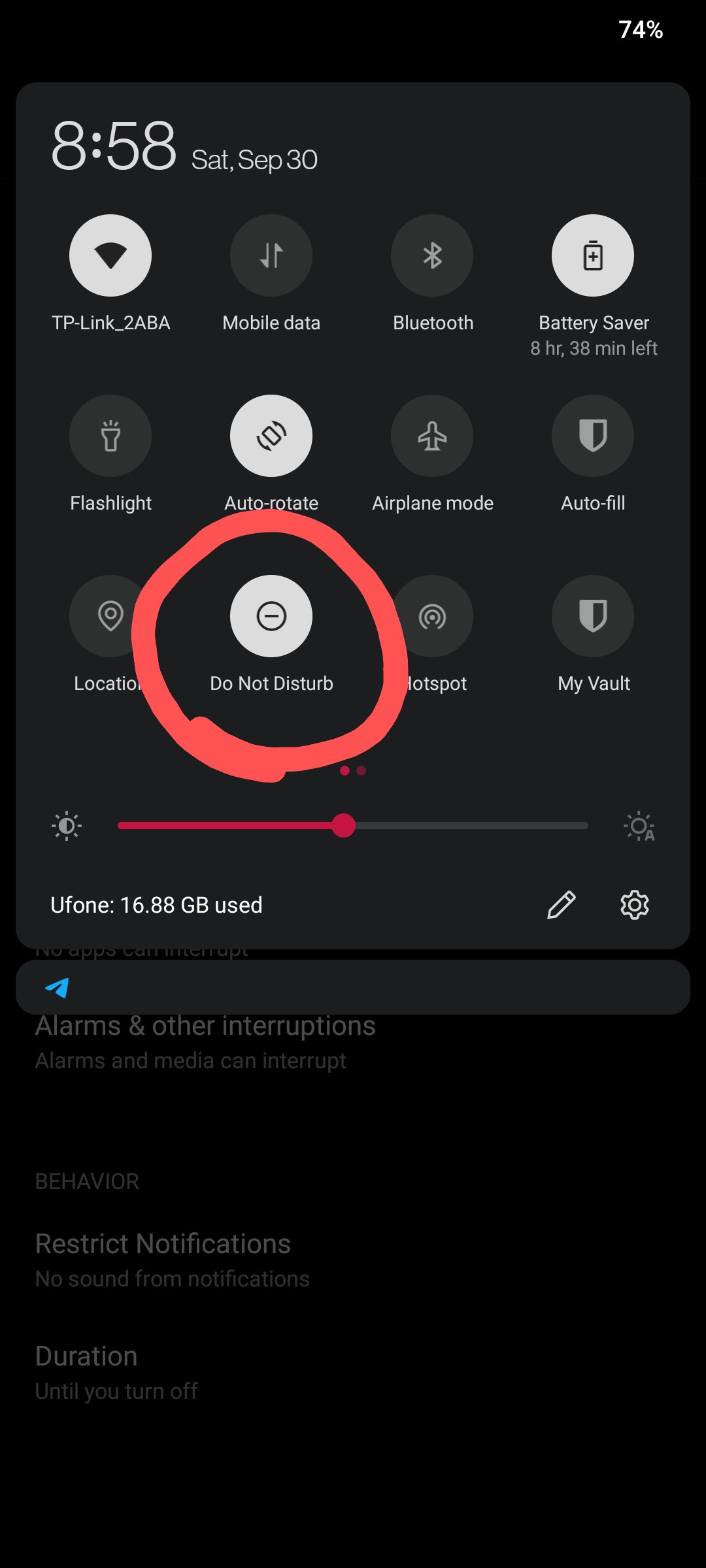 DND on Android - Tap on the circular “Do not Disturb” icon with a moon-shaped symbol to turn it off. This will look different across devices, such as instead of a moon, it’s a traffic sign on a OnePlus phone:
