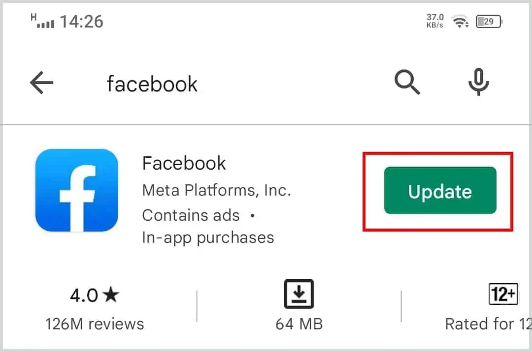 Updating the Facebook App is a last resort that you can try out. All you have to do is open the built-in app store, such as Play Store on Android and App Store on iOS, search for Facebook and press Update if one is available. Otherwise, move to the last method.
