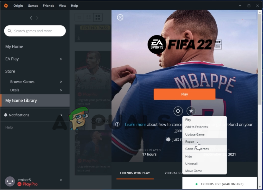 - Move to Library. Find the FIFA22 game and right-click on it.