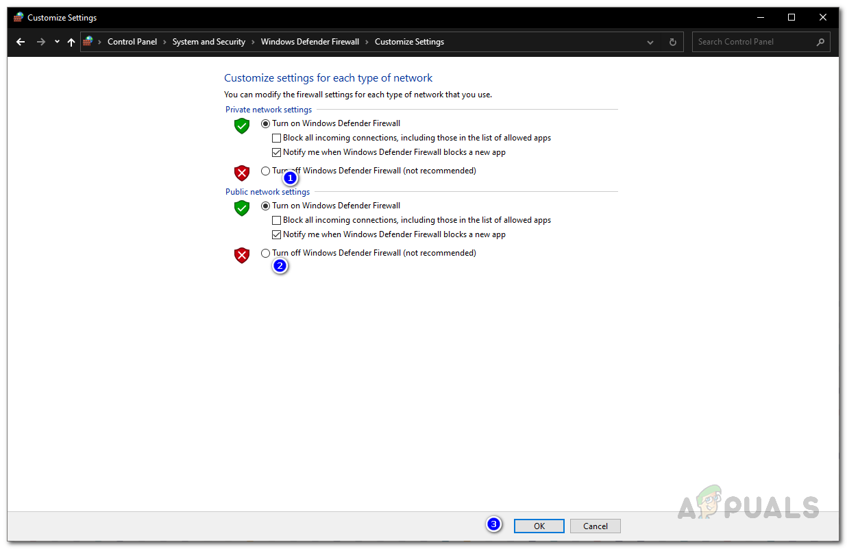 Windows Defender Firewall - There, choose the Turn off Windows Defender Firewall option under both Private and Public.
