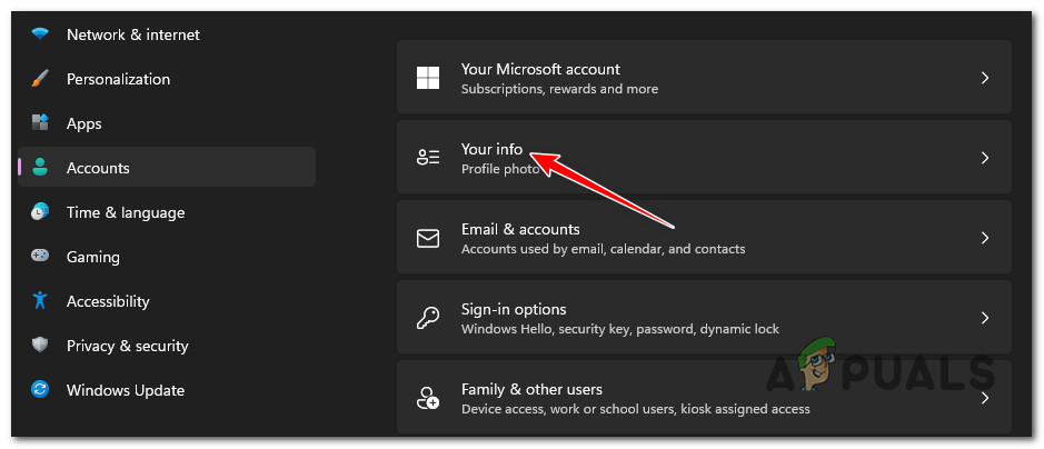 - If you’re using a Microsoft account, you will be redirected to Microsoft’s website. There, click on your name to enter the Your info section.