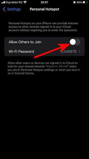 Accessing the Personal Hotspot menu - After that, press on the toggle next to where it says Allow Others to Join to turn on the hotspot.