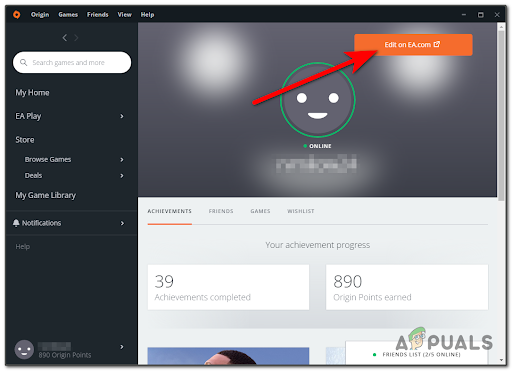 - Now that you are inside the Origin application, you need to access your profile in the down left corner of the screen, then click on the Edit on EA.com located in the opposite corner.