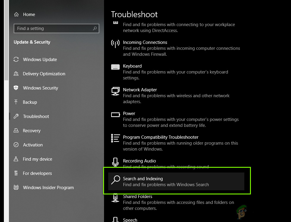 - Scroll down and select Search and Indexing, then run the troubleshooter.