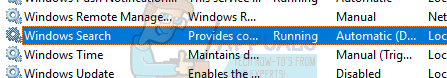 - Now browse through the list of services until you find the one named as “Windows search”. Click to open it.