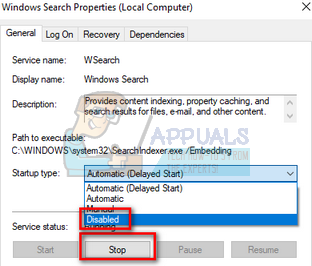 - Now stop the service by clicking on “Stop” present under the tab of Service status. Now select Startup type as “Disabled”. Click on Apply to save changes and exit.