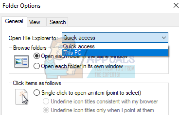 This will be by default set to Quick Access. Click it and change it to This PC.