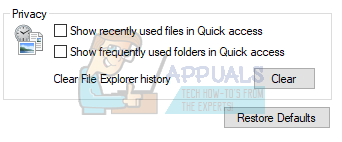 - Once the Options are opened, navigate to the General tab. Navigate to the bottom and you will see a heading named as Privacy. Uncheck both options i.e. Show recently used files in Quick access and Show frequently used folders in Quick access. Click apply, save changes and exit.